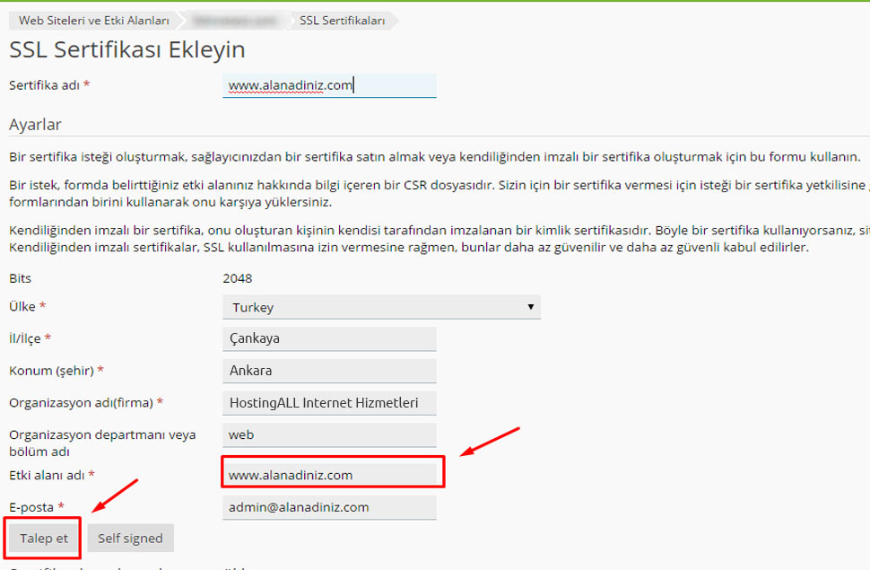 SSL kurulum işlem adımları aşağıdaki gibidir.