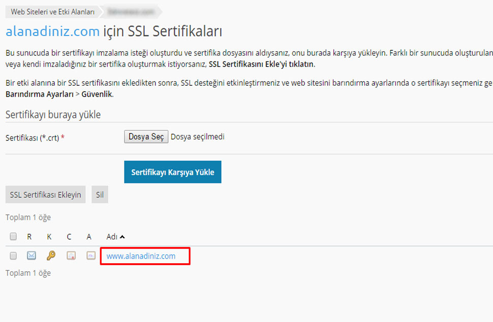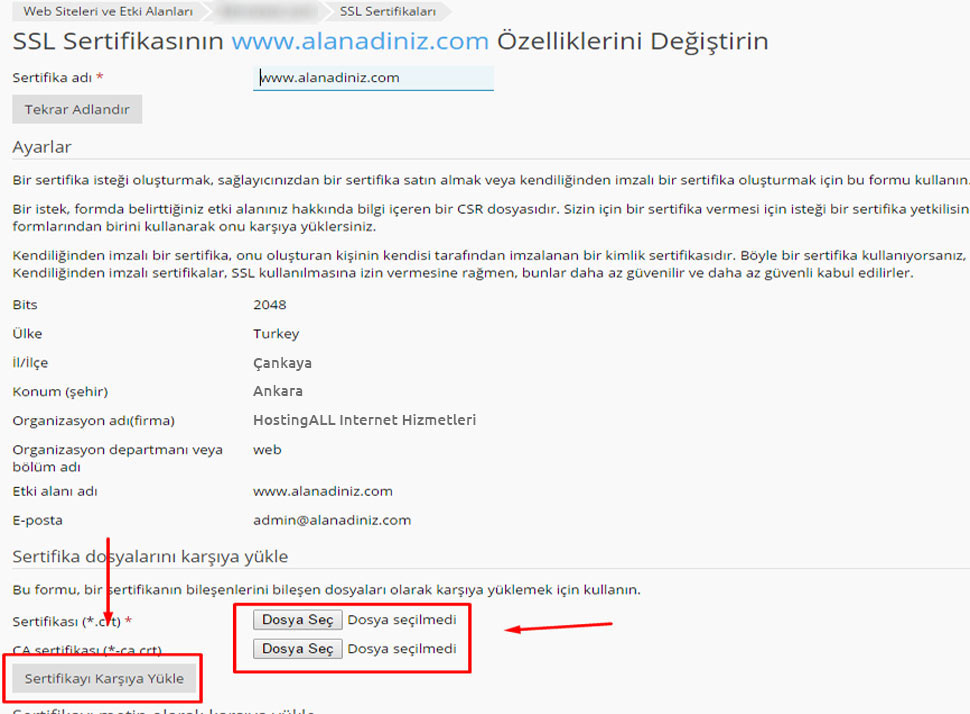 2 – Ulaştığımız arayüzde "Sertifika Dosyalarını Karşıdan" yükle bölümüne gelerek mevcut sertifika dosyalarımızı local bilgisayarımızdan seçiyoruz ve "Sertifikayı Karşıdan Yükle" butonuna basarak kurulum SSL kurulumu adımlarını tamamlıyoruz.