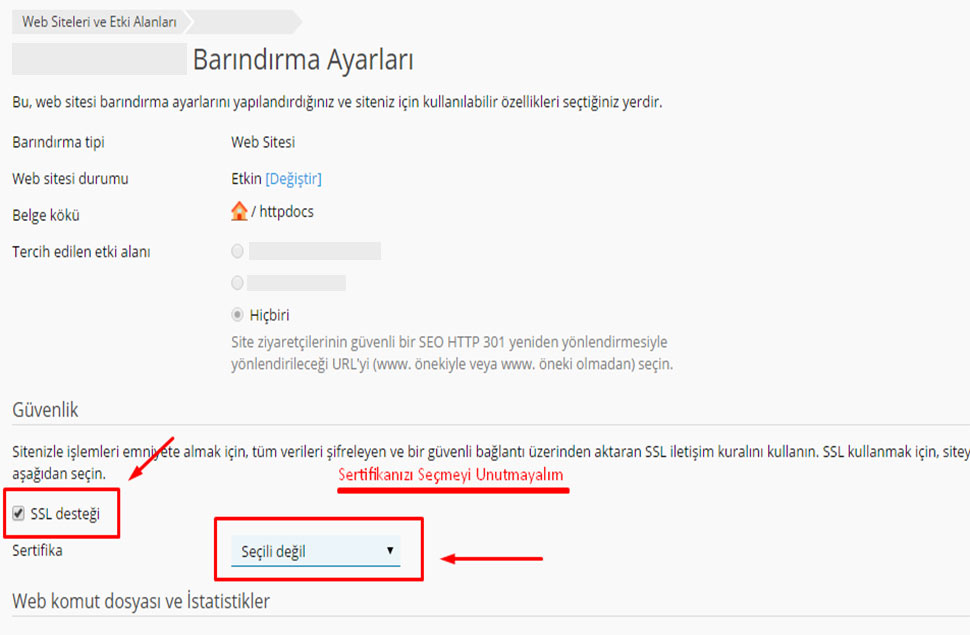 SSL kurulum adımlarımızın sonuna geldik. Son yapacağımız işlem Plesk Panel ana sayfasında barındırma ayarlarının altında bulunan SSL desteğini aktif etmek. Barındırma ayarlarında güvenlik bölümü altında bulunan SSL desteğini işaretliyoruz ve sertifika kaydımızı seçerek "Uygulayın" butonuna basıyoruz.