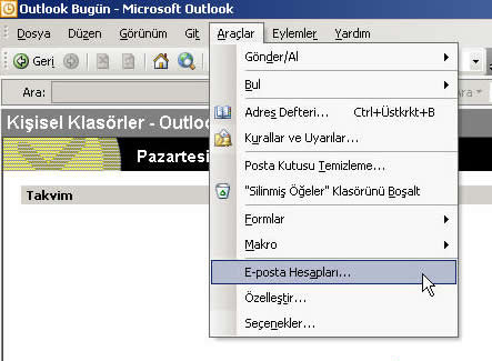 1. Aşama: Araçlar menüsü altından e-posta hesaplarını açınız.